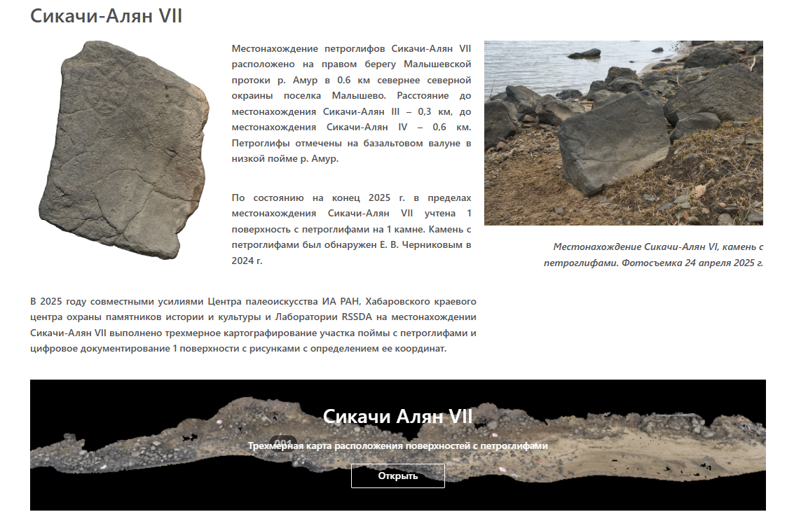 В период с 2021 по 2025 г. благодаря ежегодным полевым исследованиями был накоплен большой объем новых данных: открыты новые памятники (Никитина Падь, Сикачи-Алян VII), выявлены ранее неизвестные наскальные рисунки на уже известных местонахождениях, найдены давно не наблюдавшиеся изображения, получены новые данные о мониторинге состояния сохранности. Все эти данные были тщательно проанализированы и адаптированы для веб-показа.