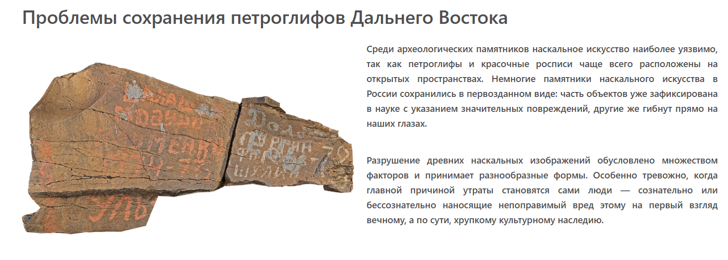 Памятники наскального искусства – одни из наиболее уязвимых археологических объектов: петроглифы и красочные росписи чаще всего расположены на открытых пространствах и страдают как из-за перепадов температуры, таяния льда и, снега, погружения в воду при разливе рек, так и из-за деятельности человека. Создание виртуальной копии изображений может стать одним из методов сохранения уникальной исторической информации, которую несет в себе наскальное искусства, а для широкой публики – возможностью «побывать» на удаленных и труднодоступных памятниках. К таким памятникам относятся и местонахождения Нижнего Амура и Уссури (Хабаровский край): Сикачи-Алян, Шереметьево, Чертово Плёсо (Кия), Калиновка, Май, Медвежьи Щёки.
