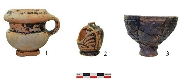 Девица V. Курган № 9. 1 – чернолаковый одноручный канфар; 2 – чернолаковый арибаллический лекиф; 3 – лепная курильница