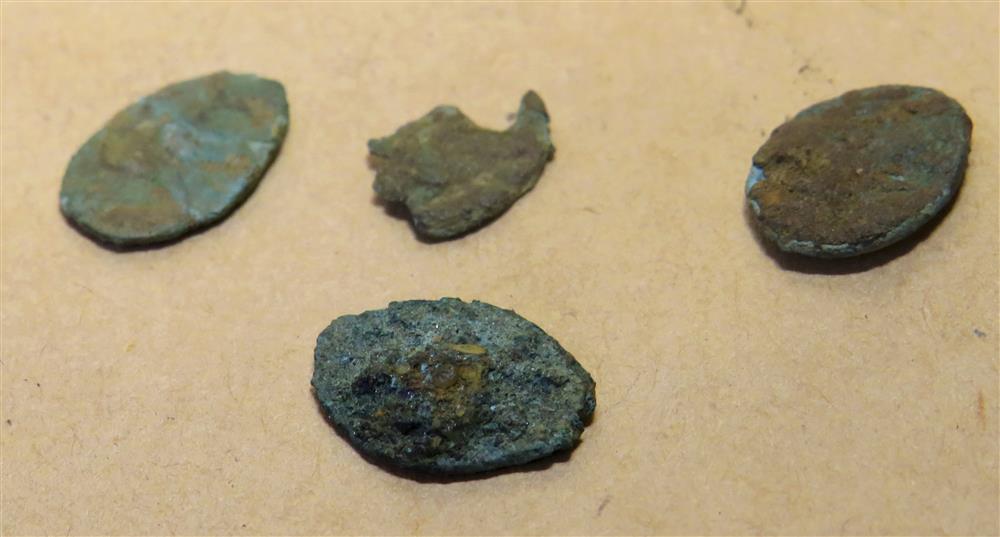 Слева – медный ковшик из сгоревшей постройки XVI в. Справа – монеты XVI–XVII вв.