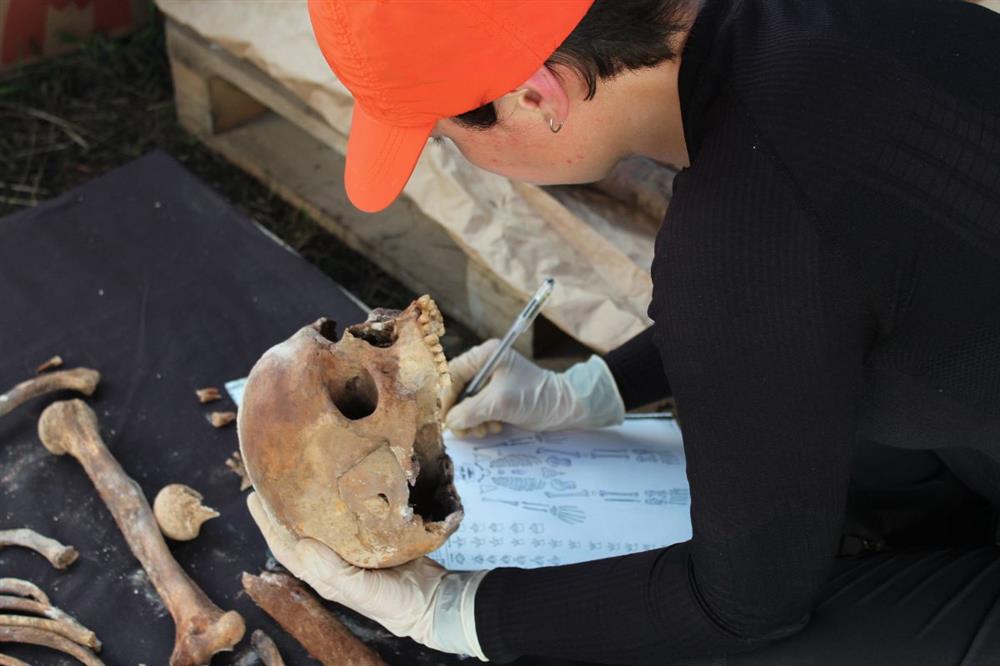 Слева: расчистка погребения. Справа: обработка фрагментов скелета