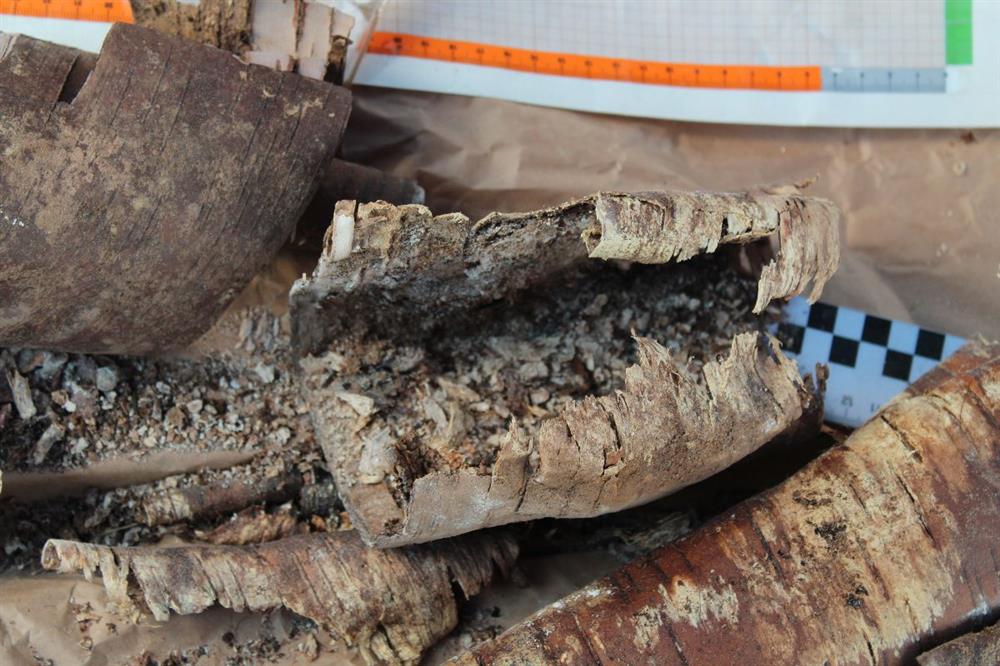 Слева: вскрытые саркофаги. Справа: береста из захоронения