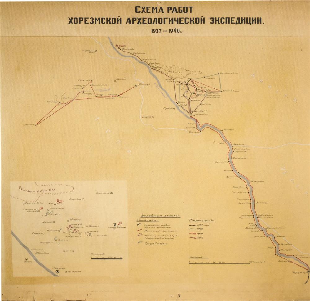 Хорезмская археолого-этнографическая (с 1945 г.) экспедиция (1937–1997 гг.) была создана Сергеем Павловичем Толстовым, руководившим её работами до 1965 г. В 1937 г. разведочные работы в Правобережном Хорезме (Кара-Калпакская АССР) проводил А.И. Тереножкин, с 1938 г. полномасштабными исследованиями, длившимися каждый сезон около полугода, руководил С.П. Толстов. В организации экспедиции участвовало 8 учреждений – ИИМК, Всесоюзная Академия архитектуры, Государственный Эрмитаж, ГИМ, Институт истории Туркменской ССР, Узкомстарис (Узбекистанский комитет по делам памятников культуры и природы), Центральный музей Кара-Калпакской АССР, Исторический факультет МГУ.