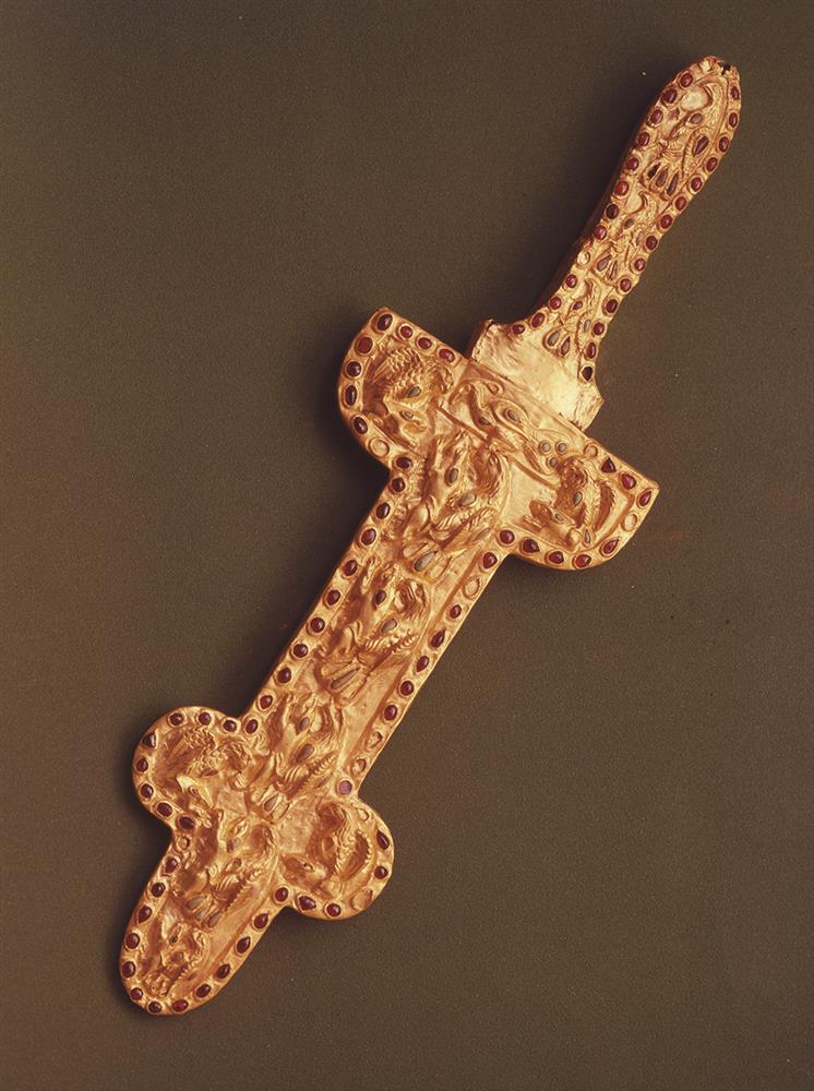 Парадный меч (орлы, павлины, орлы терзают зайца; золото, гранаты, бирюза; клинок железный, рукоятка из дерева). Некрополь Горгиппии, склеп III в. н.э.