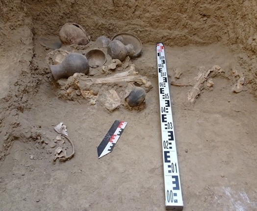 В августе в составе Кавказской экспедиции ИА РАН проводились полевые работы в рамках проекта РФФИ № 18-00-00398, посвященные мультидисциплинарному изучению памятников раннего этапа аланской культуры, расположенных в окрестностях селения Киевское Моздокского района Республики Северная Осетия-Алания. Здесь в ходе геофизического обследования, проведенного в мае 2019 г. профессором Мюнхенского университета Й. Фассбиндером, был намечен к раскопкам ряд подкурганных захоронений к северо-западу от селения. Две насыпи (кур. 254 и 265), окруженные полукольцевыми ровиками с расположенными меридионально перемычками, были раскопаны в ходе полевых работ. Диаметр ровиков составил 24 и 28 м соответственно.