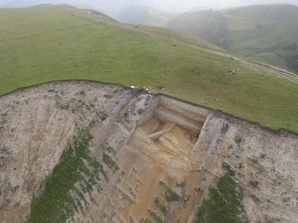 Слева: Мухкай 1. Вид раскопа 2019 года с высоты птичьего полета