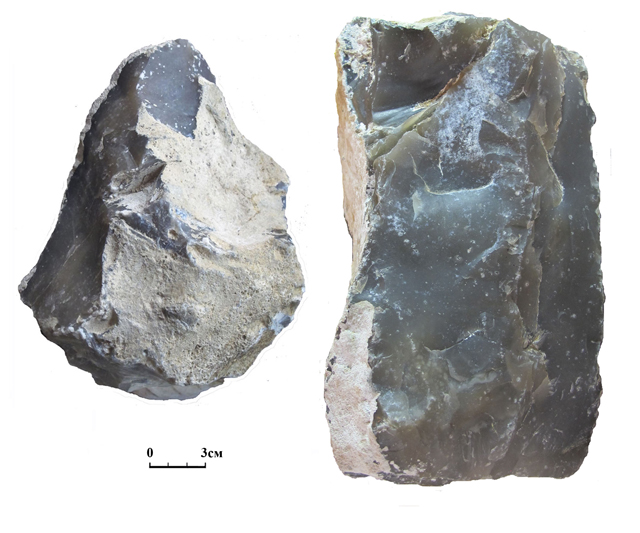 Мухкай 1, слой 4. Кремневые изделия – пик (1) и нуклеус (2)