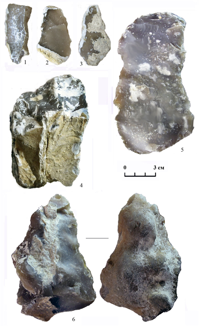 1-3 – мелкие отщепы; 4 – чоппер; 5 – скребло на крупном отщепе; 6 – нож на крупном отщепе