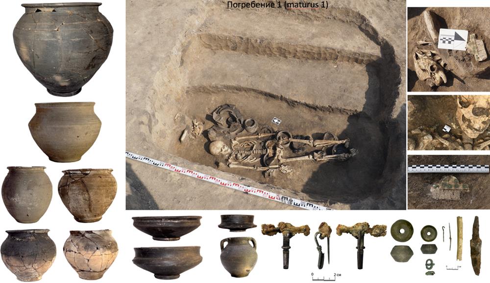 Второе погребение – женщина 20–25 лет. Ориентировка погребения головой на север-северо-запад, совершено в яме аморфной формы с небольшим углублением в западной части. Глубина 1 м от современной поверхности. Рядом с головой лежали остатки жертвенного мяса (кости) с ножом. Сопровождающие сосуды находились на небольшой приступке к востоку от тела, всего их было семь (Ваза, два “кухонных” горшка, две лощеные миски, миниатюрный горшочек и чернолощеный кубок), все сосуды круговые. Среди сосудов лежало пряслице, украшенное сетчатым орнаментом. Костюм представлен серебряной фибулой с остатками органики от ткани и железными окислами, небольшой поясной пряжкой, на шее находились стеклянные бусы синего цвета.