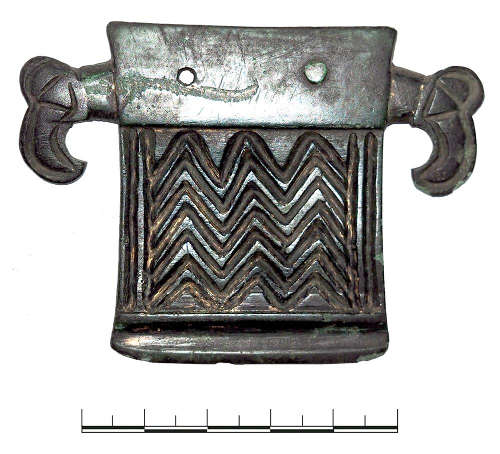Справа: наконечник ремня с клювовидными выступами с местонахождения Нарышкинский лес, вторая половина V – начало VI в.