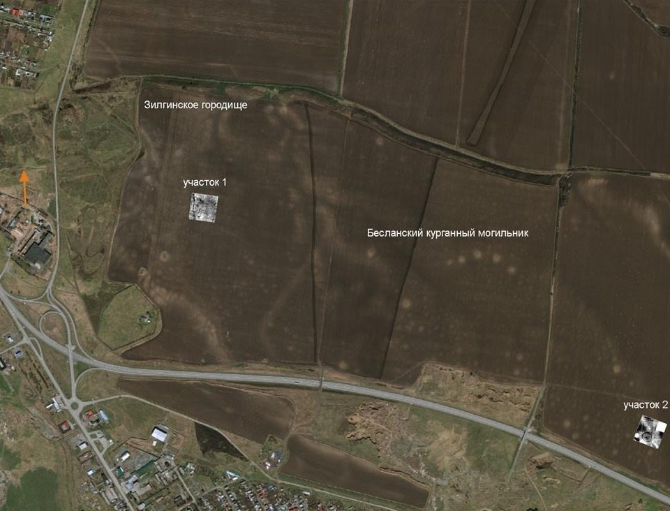 Космический снимок World View 3 с видом на Зилгинское городище и Бесланский курганный катакомбный могильник с нанесенными участками геофизического обследования. Стрелкой обозначено место устройства разрезов на выходках культурного слоя