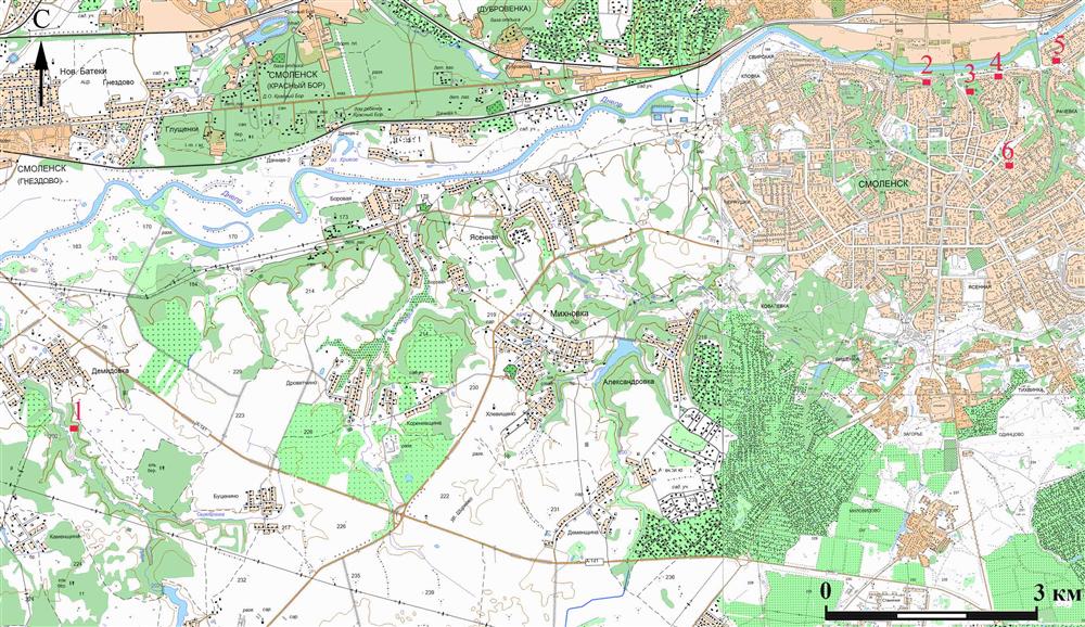 Карта работ Смоленской археологической экспедиции в 2020 г.: 1 – городище Демидовка; 2 – ул. Б. Краснофлотская 1/3; 3 – ул. Соборная, 11; 4 – ул. Соболева, 16; 5 – ул. Соболева, 49; 6 – ул. Энгельса