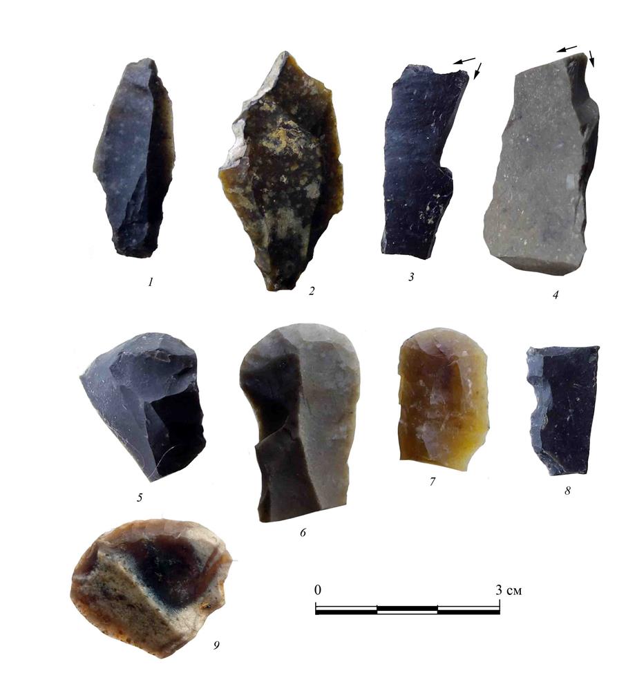 Кремневые орудия Смоленской финально-палеолитической стоянки: 1, 2 – черешковые стрелы; 3, 4 – резцы; 5-7, 9 – скребки; 8 – орудие с выемкой