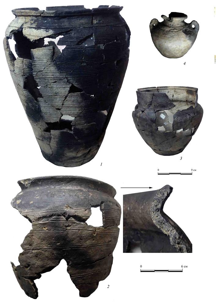 Горшки из раскопа на Б. Краснофлотской, 1/3: 1, 2 – вторая половина X в.; 3 – XI в.; 4 – XII в. (корчажка киевского типа)