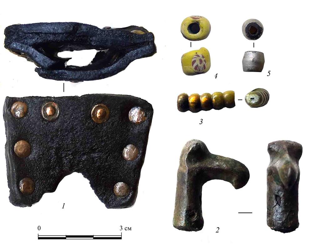 Находки из раскопа на Б. Краснофлотской, 1/3: 1 – кожаные ножны с медными заклепками; 2 – навершие плети (бронза); 3 – золотостеклянная пронизка; 4 – реснитчатая бусина; 5 – серебростеклянная бусина