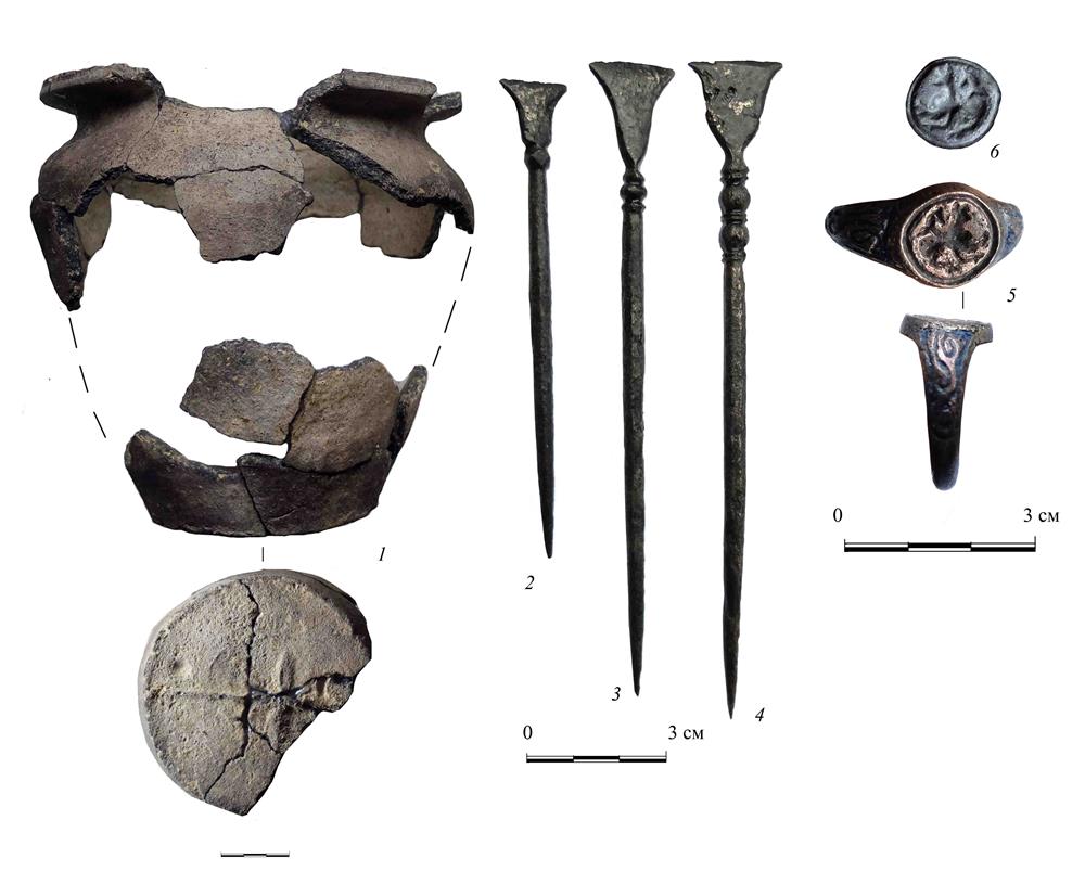 Находки из шурфа 1 на ул. Соболева, 49: 1 – горшок второй половины X в. из слоя пашни; 2-4 – писала железные; 5 – перстень печатка бронзовый; 6 – оттиск перстня