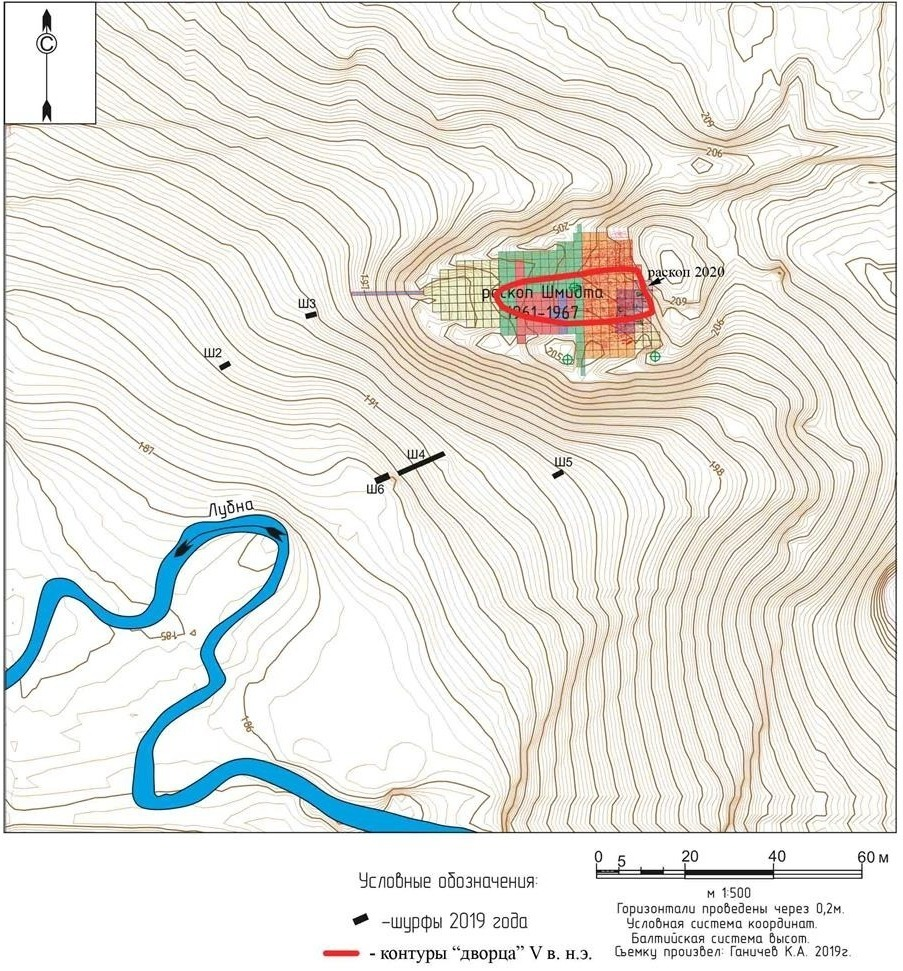 План городища Демидовка с контурами раскопов и деревянного дворца (красным) V в. н. э.