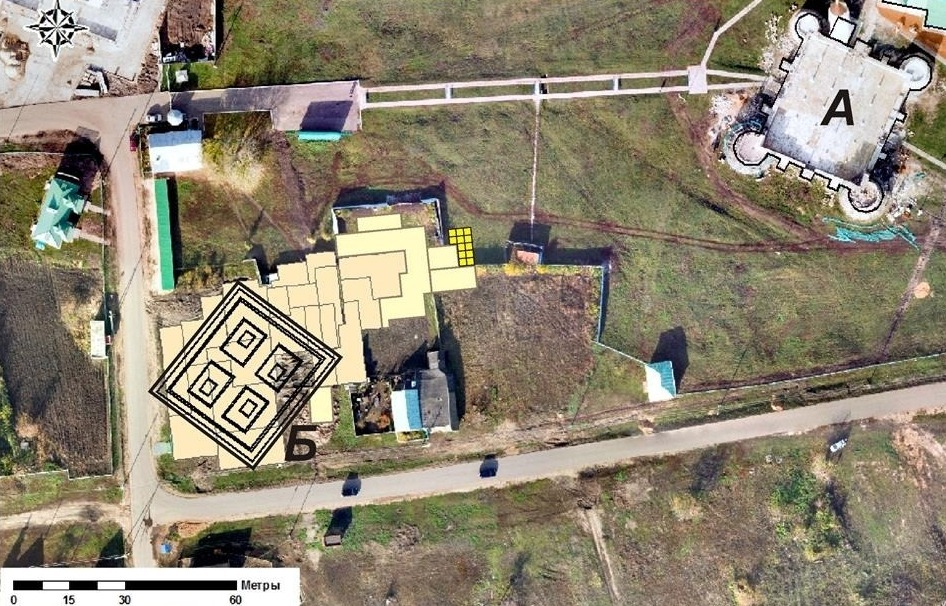Расположение участков исследования 2021 г. на спутниковом снимке: А – Соборная мечеть (середина XIIIXV в.), Б – здание городского Базара (середина ХIV в.)