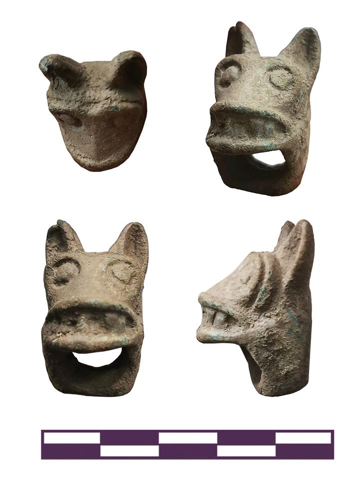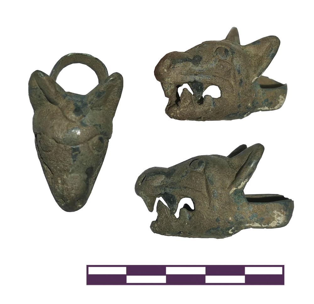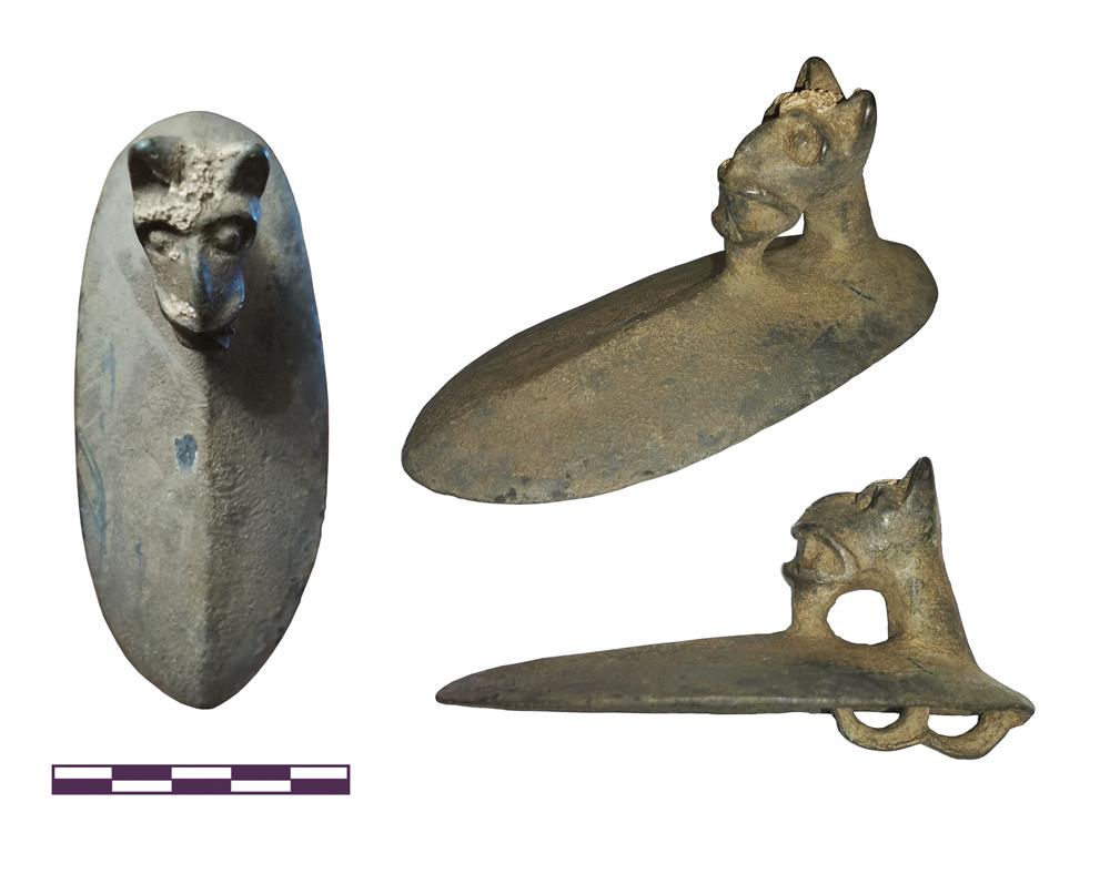 Слева: Курган 4. Бронзовая уздечная бляшка