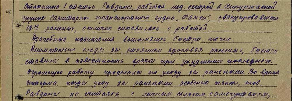 Выписка из наградного листа Т.В. Равдиной. Медаль "За боевые заслуги", 14.07.1944 г.