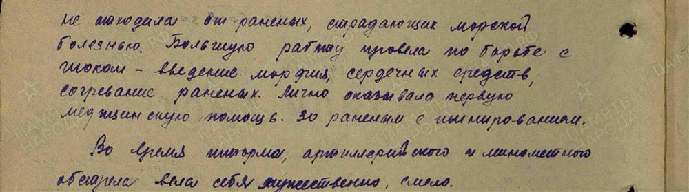 «На Ленинградский фронт я попала в сентябре 1942 года и стала работать медсестрой в военно-морском порту Кобона. Этот порт стоял на Дороге жизни, осуществлявшей перевозки в осажденный Ленинград. Все службы порта находились под землей: склады, судоремонтные мастерские, камбуз и столовая рабочей роты. Даже гауптвахта была глубоко под землёй (знаю по личному опыту). В деревне Леднево недалеко от порта в здании деревенской школы размещался стационар. Мы устроили здесь приемную, перевязочную, операционную. В бывших классах находились палаты для раненых. Электричества не было, вечерами и ночью работали при керосиновых лампах, и только в редчайших случаях порт запускал движок и давал нам свет.