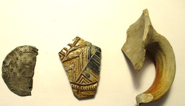 Слева: крышка зеркала и рейнская керамика XV–XVI вв.