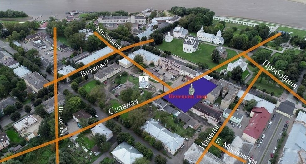 Немецкий двор, Ярославово Дворище и Торг в Великом Новгороде с трассировкой древних улиц (реконструкция)
