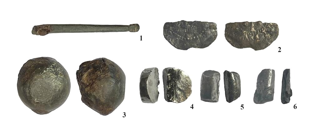 2 – половина денария серебряного династии Оттонов; 3 – гирька весовая ; 4–6 – обрезки слитков серебряных
