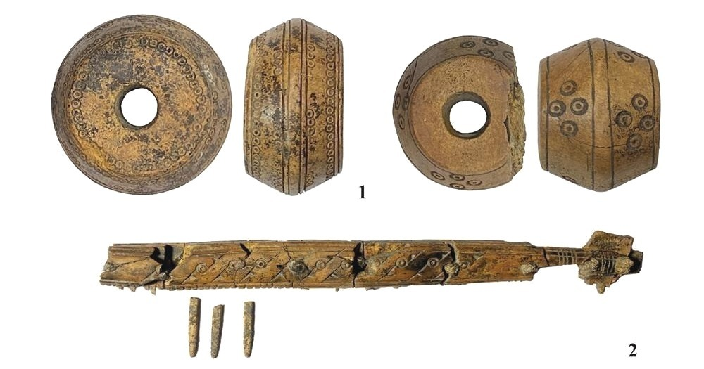 К колоритным находкам относятся два изготовленных из рога и искусно орнаментированных пряслица, а также два фрагментированных роговых гребня с циркульным и прорезным линейным декором.