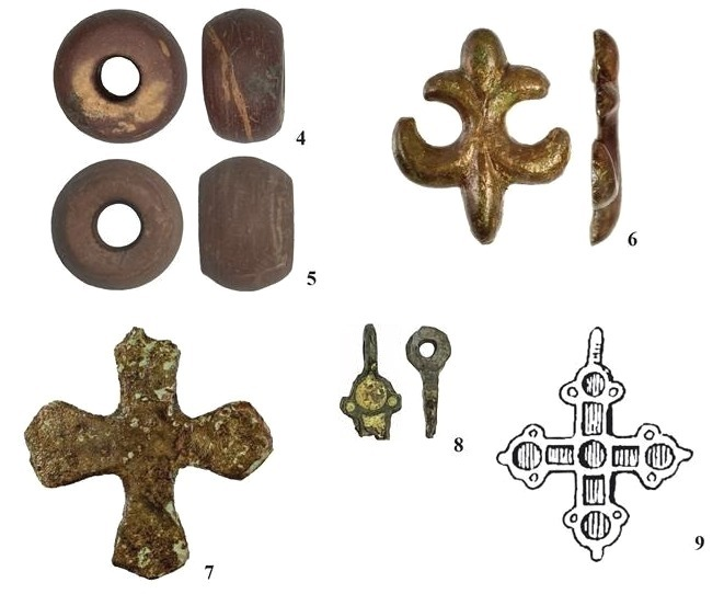 Ещё одним указанием на наличие контактов с Древней Русью может служить обнаружение фрагмента украшенного эмалью креста. Несмотря на то, что подобные находки встречаются и в странах Балтии и Польши, изначально они (непосредственно сами находки или же культурные импульсы для их локального производства) происходят с территории Древней Руси. Обнаружение уже второго христианского креста с восточноевропейским «акцентом» на ещё очень небольшой изученной площади памятника тем более интересно в свете того, что массовая (и преимущественно принудительная) христианизация пруссов началась лишь намного позднее, а именно с середины XIII в. в контексте агрессивной экспансии Немецкого Ордена.