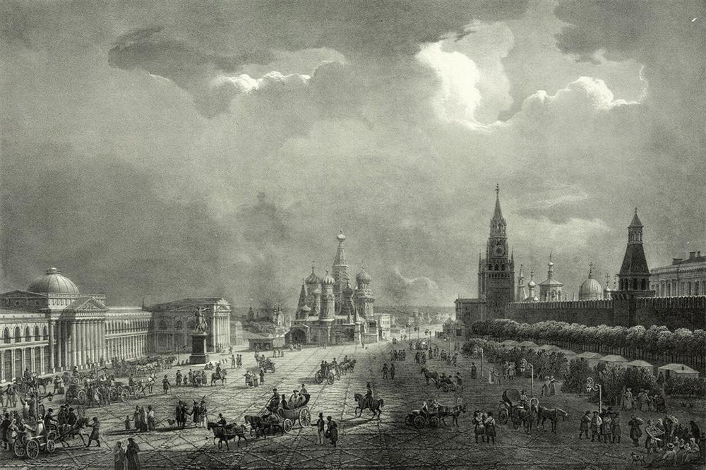 слева – «Вид Торговой (Красной) площади». Гравюра И. Л. Деруа по рис. О. Кадоля; альбом «Виды Москвы», Париж, 1825);