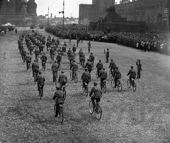 справа – Парад велосипедистов на Красной площади. 1924 год. Фото: Аркадий Шайхет (1898–1959)