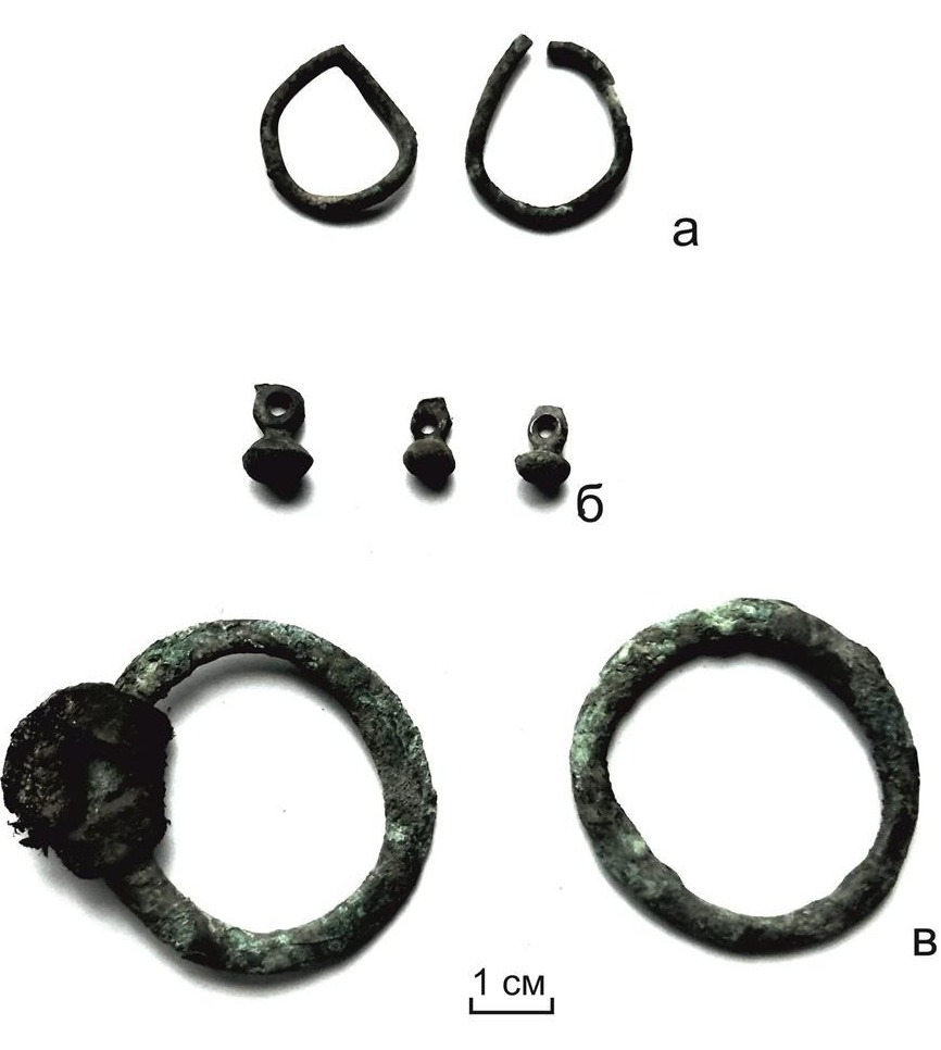 а – височные кольца медного сплава, б – пуговицы, в – пряжки от кожаного ремня