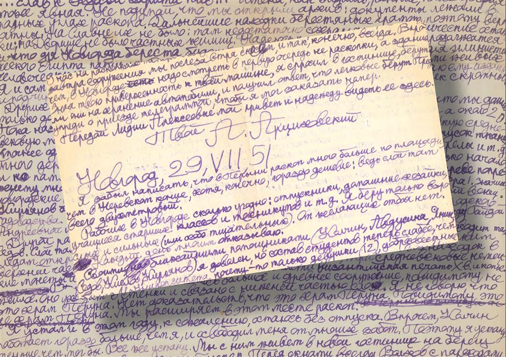 В Институте археологии РАН ведется работа по сбору, копированию и подготовке к изданию переписки А.В. Арциховского. С этой целью был обследован ряд личных фондов, хранящихся в Научно-ведомственном Архиве ИА РАН. Ниже публикуется письмо А.В. Арциховского коллеге и близкому другу С.В. Киселёву, выявленное в его личном фонде.