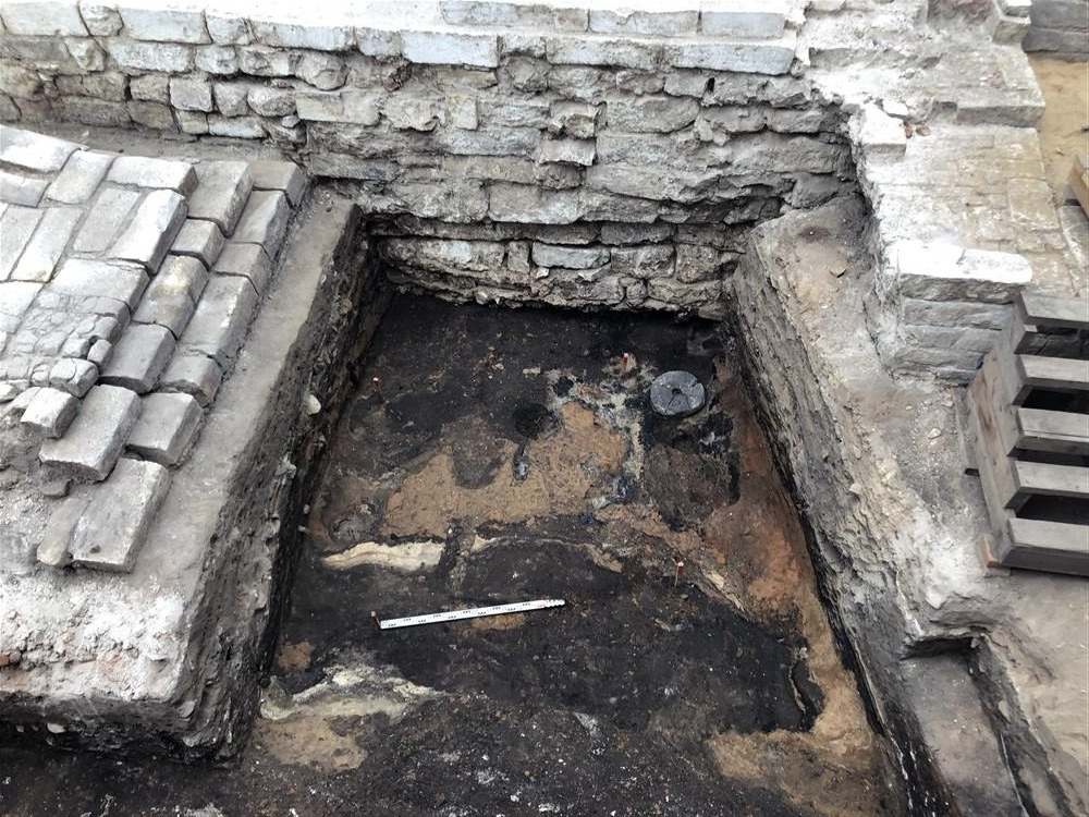 Один из главных результатов нынешнего сезона раскопок – выявление остатков городских усадеб (или одной усадьбы?) с плотной застройкой XIV – первой половины XVI в. на территории, где позднее размещались административные здания. На небольших участках с культурным слоем этого времени, избежавших разрушения при строительстве, зафиксированы остатки печей и глубокие ямы-погреба с впущенными в них деревянными срубами, располагавшиеся под наземными постройками. Некоторые из этих погребов выделялись крупными размерами, со стороной сруба около 5 м, необычными для рядовых городских строений. Ранее остатки подобных погребов исследовались в раскопках на Подоле Кремля и на месте 14-го корпуса. Часть построек погибла в пожарах, о силе которых свидетельствует растрескавшиеся под воздействием огня белокаменные мельничные жернова, расчищенные внутри одной из построек. Постройки сменяли другу друга на одном и том же месте, при устройстве новых погребов прорубались деревянные стенки старых, пришедших в негодность и засыпанных.