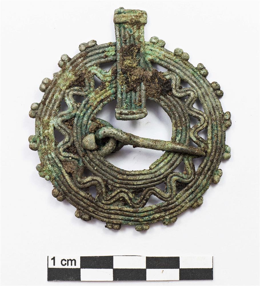 Женские погребения на могильнике ограблены и об уборе мы можем судить только по находкам в парном погребении 8. Здесь слева от мужчины была погребена женщина в уборе, характерном для муромы позднего этапа, когда он утрачивает головные жгуты. В состав головного убора входит венчик с пронизковидными привесками в области висков и височными кольцами муромского типа.