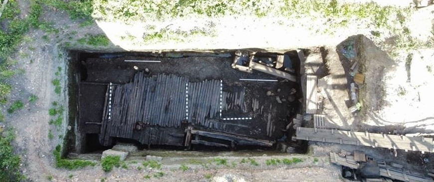 Работы на раскопе начаты в середине июня. К настоящему времени изучено полтора метра культурного слоя, датирующегося второй половиной XIII – XIV в. Остатки деревянных сооружений, включающих кроме срубов замощение въезда на усадьбу с Большой Пробойной улицы, и собранная вещевая коллекция (около 1700 находок!) полностью подтверждают связь раскапываемой усадьбы с Немецким двором, что в 2021 г. высказывалось лишь предположительно.