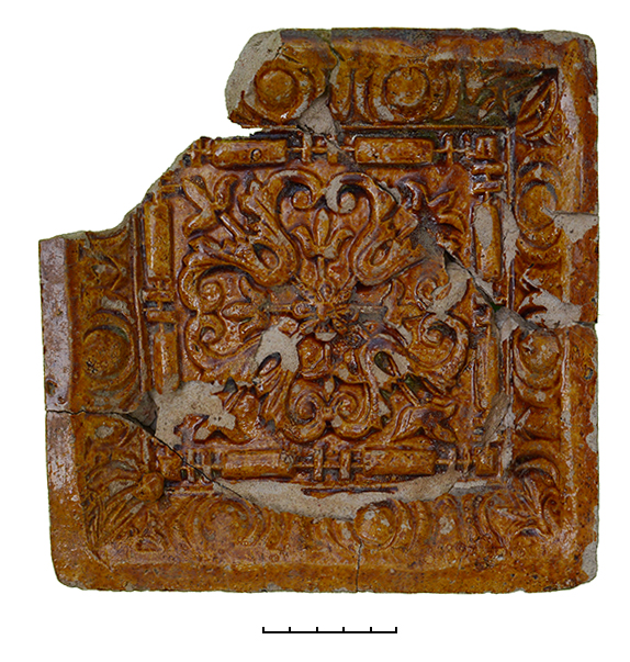Остатки Приказных палат 1591 г. в раскопе не выявлены. Возможно, с ними связана одна из строительных прослоек известковой крошки, документированная в культурных отложениях конца XVI в., а также дощатые дворовые вымостки, расчищенные на значительной площади. Зафиксировано уже 5 ярусов таких мощений, набранных из нешироких досок, которые сменяли друг друга и укладывались каждый раз в различных направлениях. Вероятно, раскопками раскрыта небольшая часть обширного двора (внутренний двор «Старых приказов»?), мощение которого проводилось от случая к случаю и не самым качественным материалом, т.е. наспех и довольно небрежно. С печами, стоявшими в «Старых приказах», можно связывать обширный комплекс красных рамочных изразцов с рельефными изображениями (батальные сцены, фантастические животные, геральдический двуглавый орел, растительные мотивы). Исключительный интерес представляют находки двух белоглиняных изразцов с рельефным изображением сложной розетки с золотисто-коричневой прозрачной поливой, изготовленных в западноевропейской ренессансной традиции. Ранее такие изразцы, относящиеся к «элитным» печным наборам, встречены в раскопках лишь дважды – в Московском Кремле на территории великокняжеского дворца и в Александровой слободе.