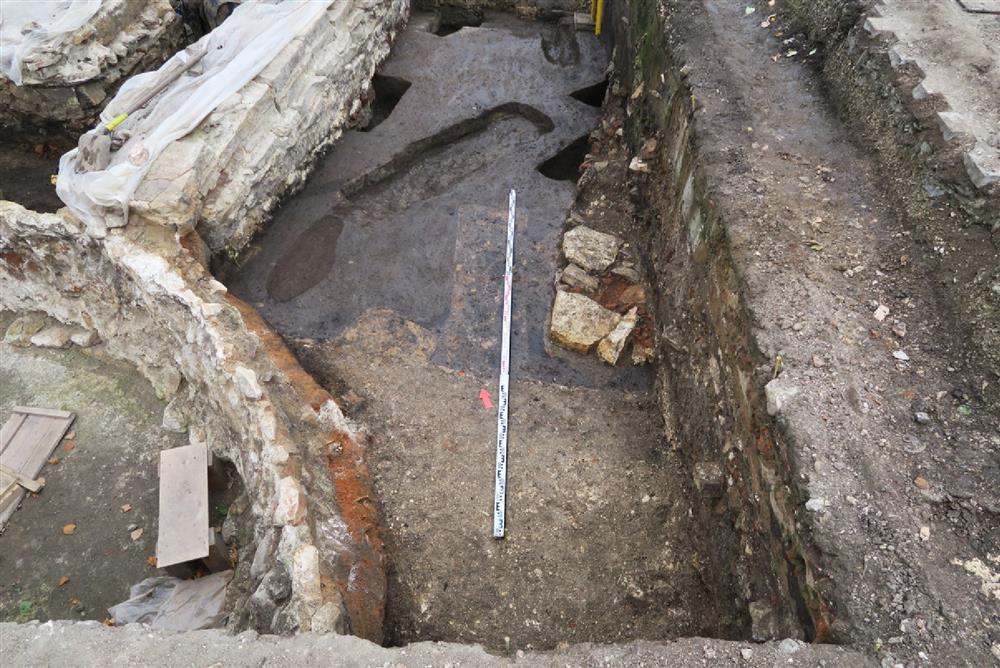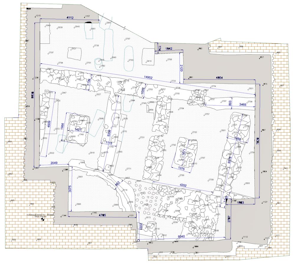 В заложенном здесь раскопе под булыжной мостовой XIX в. и мощной нивелировочной подсыпкой выявлены ленточные фундаменты, выполненные во рвах с почти вертикальными стенками, из постелистых плит местного известняка на известковом растворе и глине, сохранившиеся приблизительно на две трети – половину своей высоты. Их оси составляют три прямоугольные в плане ячейки, примыкавшие с запада к более широкому фундаменту, от которого раскрыты два взаимно перпендикулярных фрагмента, образующих один из углов здания.