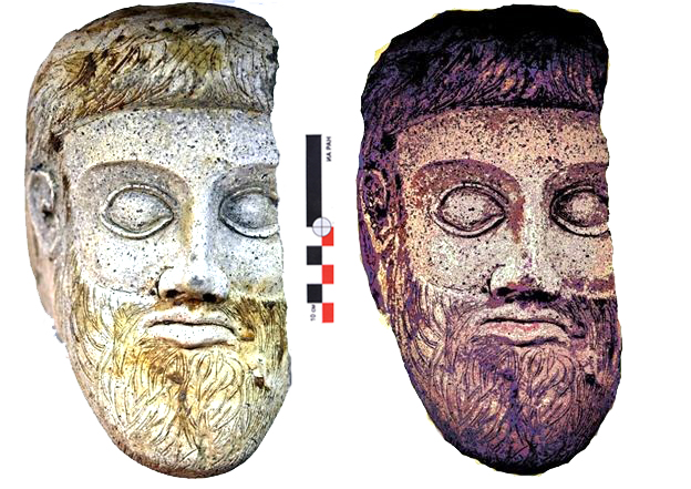 Тщательный осмотр и проведённая в Керченском музее фотограмметрическая съёмка скульптуры показали, что в углублениях, имитирующих бороду и волосы, а также в межгубной щели находятся фрагменты темно-коричневого материала. Слабые пятна сохранились также на некоторых участках ровной поверхности посреди линий волос. После графической реконструкции окраски скульптуры методом усиления цветового контраста эти пятна проявились в виде сплошного покрытия, но при этом на поверхности лица, щеках, лбу и в ушных раковинах тёмный материал и пигментные пятна отсутствовали.