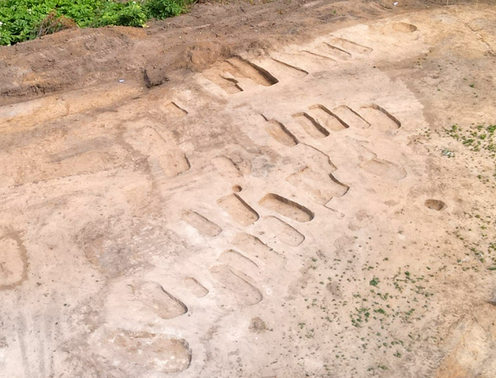 В ходе спасательных археологических работ, предваряющих строительство скоростной автодороги Москва–Казань, экспедицией института археологии РАН под Муромом на площади 3,5 га полностью раскопано средневековое селище Чаадаево 5. За пределами усадебной застройки, на мысу у ручья, был исследован некрополь, связанный с селищем. На нем раскопано 46 захоронений, совершенных по христианскому обычаю. Погребения совершены в грунтовых могилах, ориентированы головой в западном направлении и практически все безынвентарные. Только в отдельных захоронениях обнаружены остатки костюма – в 5-ти погребениях (2 женских, 2 мужских и детское) найдены металлические пуговицы, в женском захоронении обнаружены плосковыпуклые квадратные серебряные с позолотой нашивные накладки, вероятно, от очелья. В трех погребениях были выявлены текстильные фрагменты, вместе с которыми в двух случаях прослежены кусочки бересты. Все эти находки являются остатками декоративного оформления костюма домонгольского периода.