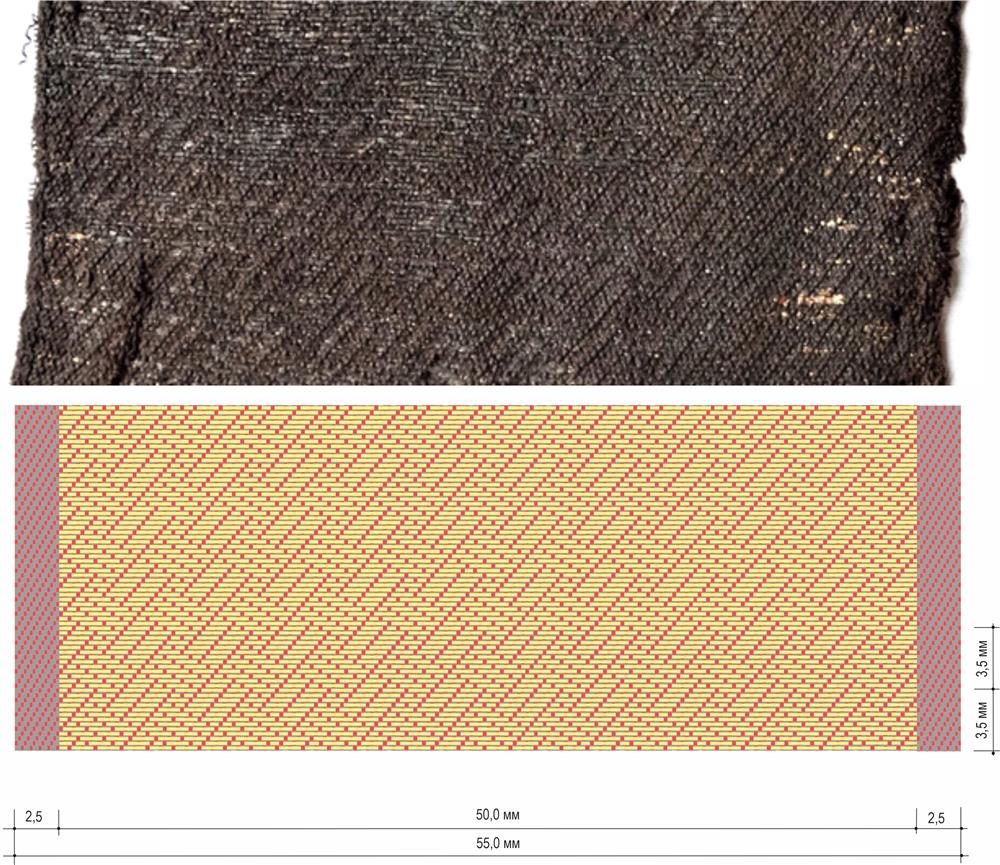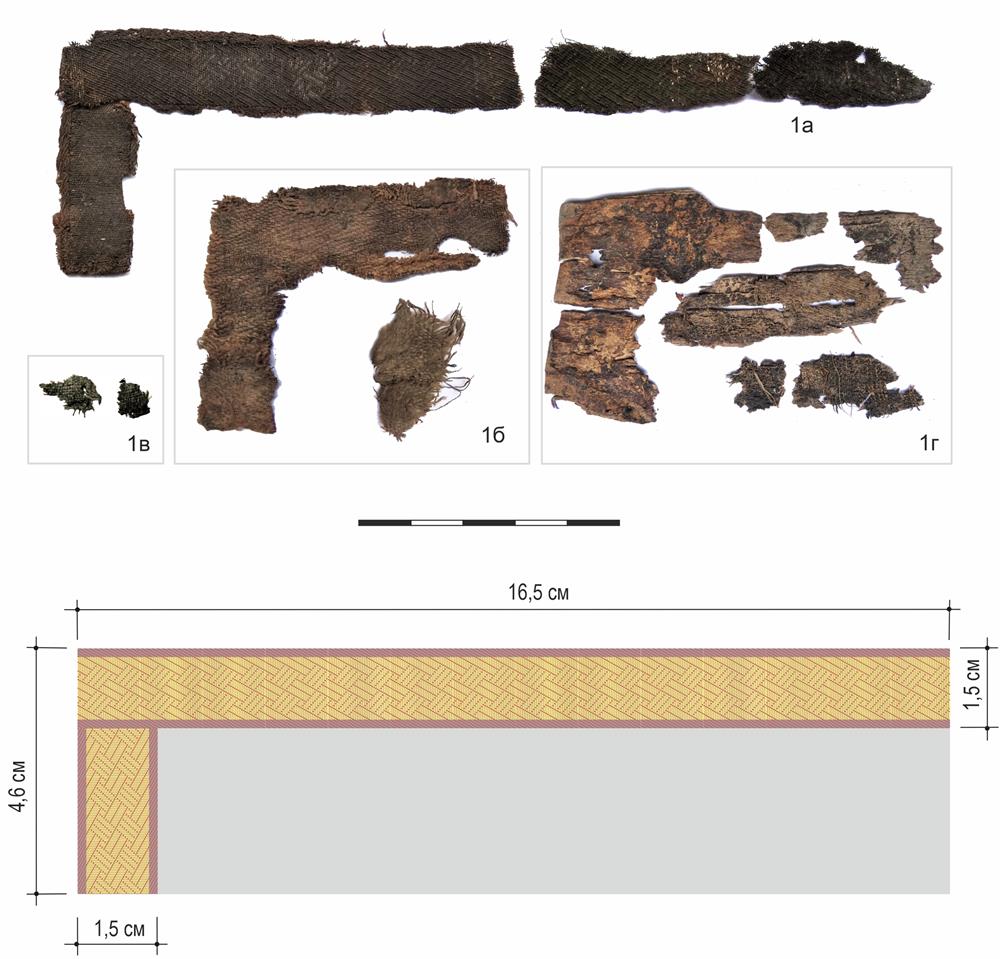 Находка представляет собой полосу ткани длиной 12,1 см и шириной 5,5 см. Изделие составлено из двух деталей, соединенных вертикальным швом: широкой тканой золотной ленты с орнаментом «плетенка» и темной шелковой ткани самит. Остатки бересты (обнаружены вместе с текстилем) показывают, что изделие было жестким. Подкладочная ткань не сохранилась, но она присутствовала, на что указывают остатки бересты и проколы от иглы по нижнему и верхнему краям ленты.