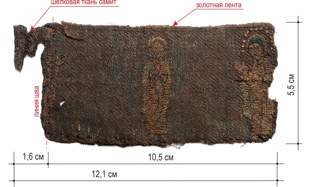 Остается открытым вопрос: деталью какого изделия является этот фрагмент с вышивкой? Ввиду того, что он был на жесткой основе и сама вышивка предполагает ее демонстрацию, то вполне возможно, что это какая-то часть головного убора или очелья. Судя по археологическим находкам, традиция изображения святых на головных уборах присутствовала в домонгольской Руси. Так, апостолы были вышиты на очелье из женского захоронения в кургане 1 в Иворовском некрополе под Старицей, изображение Михаила Архангела с копьем в правой руке зафиксировано на очелье женщины, погребенной в кургане 38 могильника Володино 2 Вологодской области. Известна находка очелья с вышитыми ликами святых и крестами на черепе погребенной в подкурганном погребении Карошского могильника Ярославской области. М.А. Сабурова при анализе фрагментов тканей с христианской символикой считает, что о таких изделиях говорится в Новгородской грамоте XII в., в которой при перечислении различных одежд упоминаются «головные уборы с обшивкой».