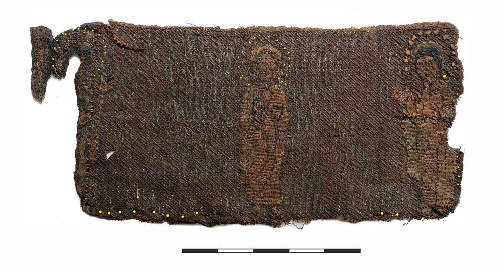 Но наибольший интерес представляет уникальная находка из захоронения 28, в котором погребена женщина 16–25 лет. Текстильный фрагмент обнаружен справа от черепа, в 30 см от него. В этой части погребение было нарушено пахотой, в результате чего, вероятно, фрагмент был сдвинут с первоначального места.