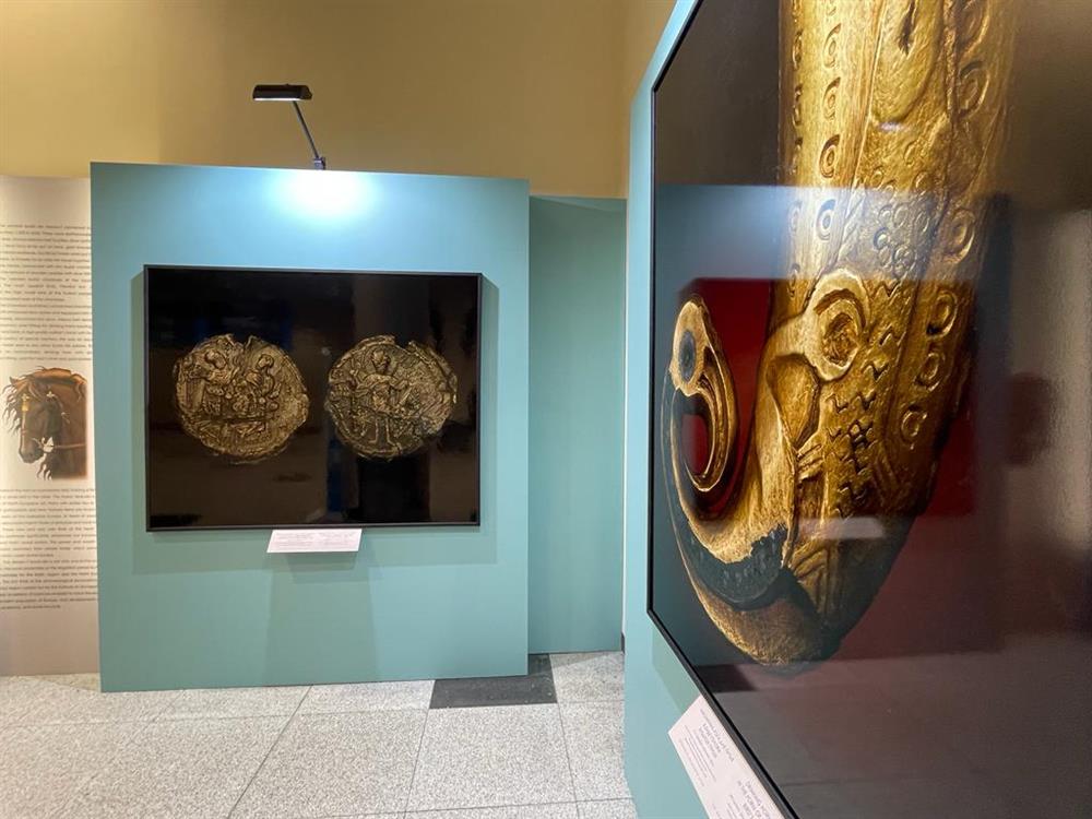 Гости аэропорта смогут увидеть изображения редких находок: янтарного ожерелья, возраст которого более 6 тысяч лет, уникального рога для питья с серебряной позолоченной оковкой и наконечником в виде хищной птицы, женского золотого украшения – лунницы, стилизованной головы воина из некрополя Алейка и другие фотографии. Фотоработы выполнены художником-фотографом, сотрудником ИА РАН, Андреем Бронниковым в технике макросъемки, которая позволяет разглядеть мельчайшие детали предметов.